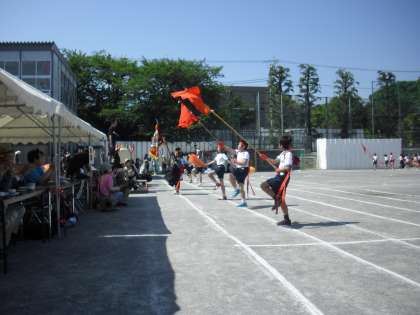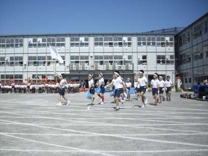 入場行進の様子です。紅白の応援団を先頭に、子どもたちは胸をはって、指先を伸ばし腕を大きく振って行進します。堂々とした入場行進です。