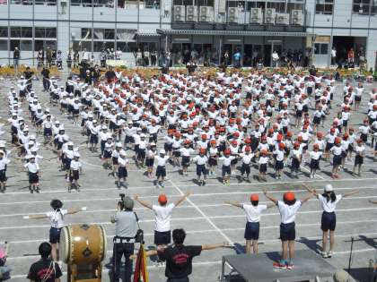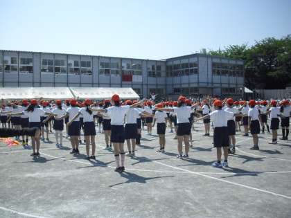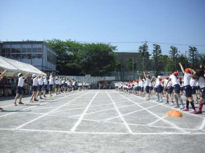 最初の演技である準備運動の様子です。まぶしい日差しが降り注ぐ校庭に、子どもたちの動きが映えます。これからのそれぞれの種目で力が発揮できるように、しっかりと準備運動に取り組みます。
