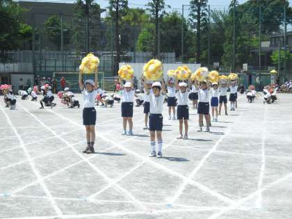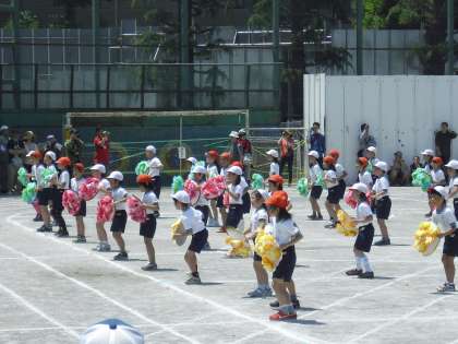 3年生の表現「おどっちゃおうよ!花笠」の様子です。クラスごとに作った黄色、赤、緑の花紙を使った笠を持ちながら踊ります。笠を扱いながらの振り付けもお見事です。笠に付けた鈴の音色がアクセントになっています。