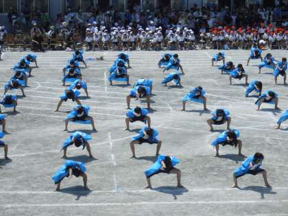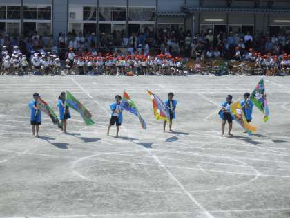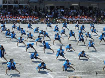 4年生の表現「芦花小ソーラン2012」の様子です。手作りの大漁旗を先頭に入場した4年生。おそろいの青いはっぴに身を包み、腰を低くした姿勢で力強く踊ります。練習の成果が見事に発揮されました。