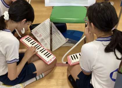 6年生音楽の授業では、鍵盤ハーモニカで「ラヴァーズコンチェルト」を演奏しています。自分たちの力で階名(ドレミ)を書き、その楽譜を使って、繰り返しメロディや低音を練習しているところです。音楽会での経験も生かされ、鍵盤ハーモニカの指使いや奏法を正しく演奏している姿が、印象的でした。これから、全体で合わせるのが楽しみです。