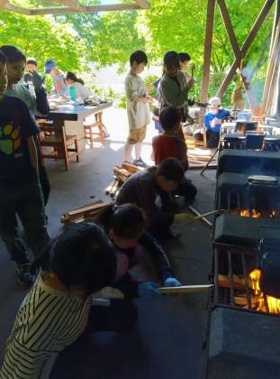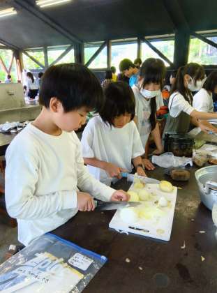 かまど係、飯ごう係、カレー係に分かれて生活班で協力して夕食を作ります。