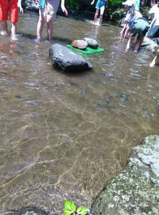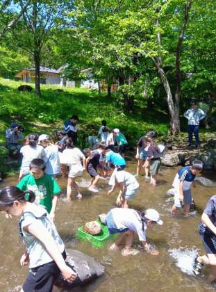 放流されたマスを自分たちでつかみました。最初は怖がりながらも、最終的には多くの児童がとても満足げな様子でした。このあと食べるのが楽しみです。