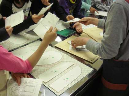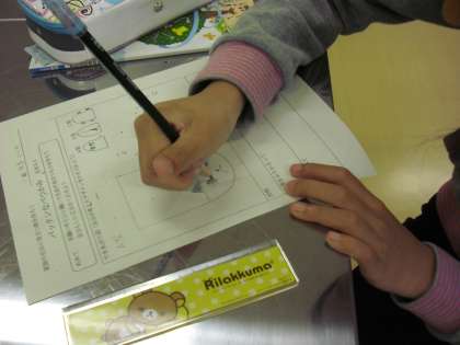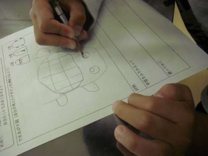 6年生の家庭科の授業の様子です。「なべつかみ」の製作を始めたところです。学習カードに自分のなべつかみのデザインを考えて描いています。実生活で活用できるものを作ることは子どもたちにとっても楽しみなことです。
