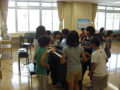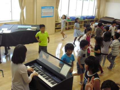 2年生の音楽の授業の様子です。「幸せなら手をたたこう」のピアノの伴奏に合わせて体を動かしながら音楽に親しんでいます。たたく部位を変えたり、リズムの速さを変えたりしながら音楽室全体を使って楽しみました。