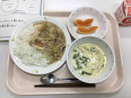中華丼、にら玉スープ、カラーマンダリンオレンジ、牛乳です。