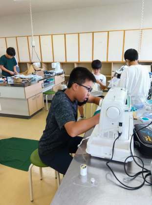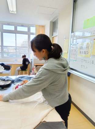 家庭科「作って使おうMYエプロン」の学習でオリジナルのエプロンを作っています。