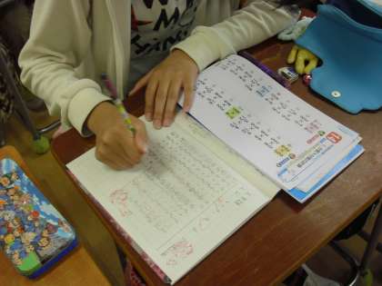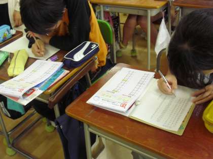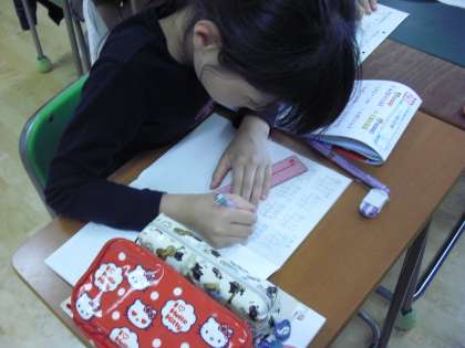 6年生の算数の授業の様子です。授業終了の5分間で計算ドリルに取り組んでいるところです。計算ドリルは最後まで終えても、くり返して使っています。何度もくり返すことで計算力の習熟を図りたいと考えています。