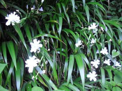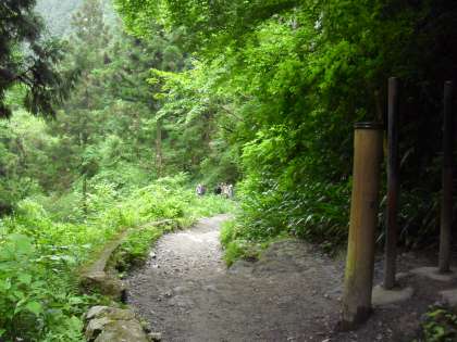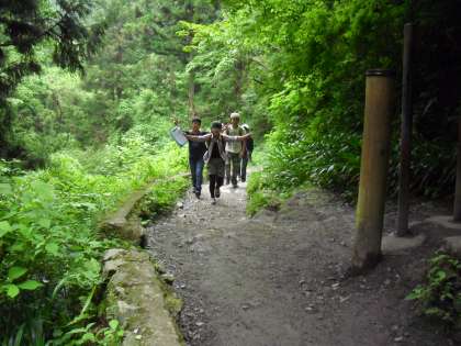登りは、6号路「びわ滝コース」を歩きます。出発してしばらくすると登山道の脇にはシャガの花が咲いています。季節の草花を観察しながら登るのも楽しみの一つです。びわ滝のチェックポイントで、グループごとに安全確認の報告をします。