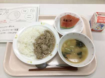 今日は、ポークジンジャー丼、野菜のみそ汁、小玉すいか、牛乳です。