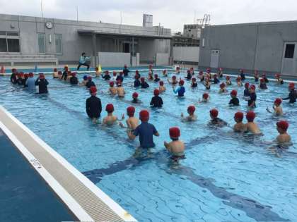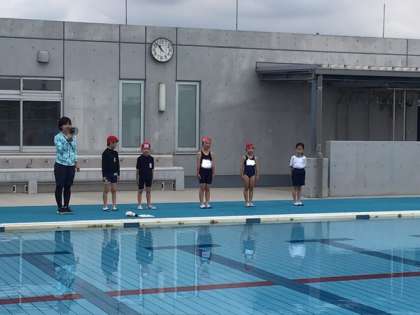本日、プール開きを行いました。先生の話を真剣に聞き、プールでの学習で大切なことを確認しました。また、代表の2年生が水遊びの学習で頑張りたいことを発表し、全員が「浮いたり潜ったりできるようになるぞ!」という気持ちを高めました。今日のプールの水は少し冷たかったけれど、水をかけあったり、生き物になりきったりして楽しく遊びました。