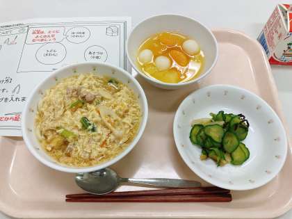 今日は、かきたまうどん、野菜の浅漬け、フルーツ白玉、牛乳です。