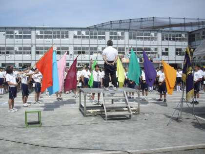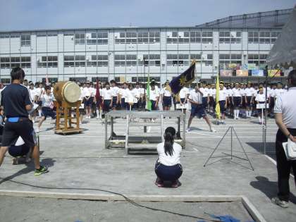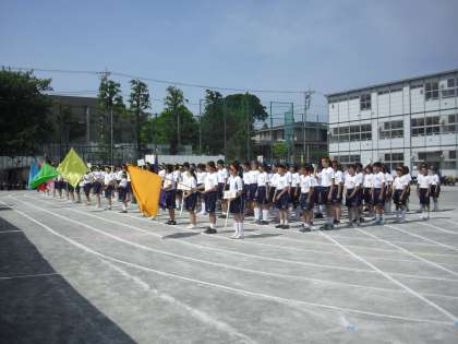 天候に恵まれ、予定通り芦花中学校の体育祭が行われました。生徒の入場行進の様子です。きれいな列を成して堂々とした行進です。開会式では、生徒による校旗の掲揚、選手宣誓の様子です。生徒の動きはとてもきびきびとしています。