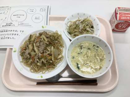 今日は、青椒肉絲焼きそば、中華サラダ、豆腐とたまごのスープ、牛乳です。