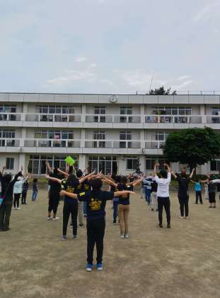 河口湖は気持ちのよい朝です。朝会で体操をしました。