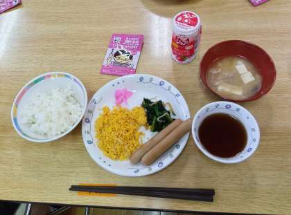 今日の朝食はご飯、豚汁、スクランブルエッグなどです。たくさん食べて力をつけて、ハイキングに行ってきます。