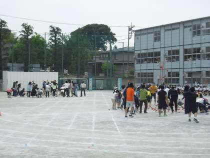 来賓・PTA・職員競技の玉入れです。小学生や小学校の教員も参加しました。子どもの玉入れを見ているのとは違い、やってみると意外に難しいようです。それでも両チームともにたくさんの数を入れることができました。保護者と教職員の交流の機会にもなりました。