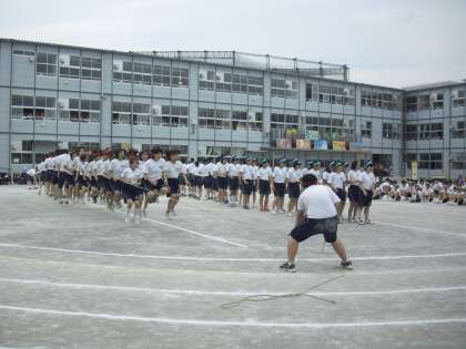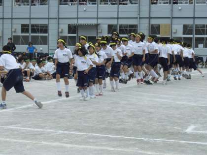 全学年によるクラス対抗の大縄跳びです。クラスが団結して取り組みます。「せ〜の」と声をかけながらジャンプするタイミングを合わせます。一つのことを全員で行うことで連帯感も高まります。顔を真っ赤にしながら真剣に取り組む姿がすばらしいです。