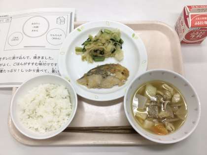 今日は、ごはん、鰆のねぎみそ焼き、野菜のおひたし、けんちん汁、牛乳です。