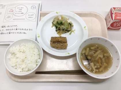 今日は、ごはん、いかのかりんとう揚げ、野菜のからしあえ、かしわ汁、牛乳です。