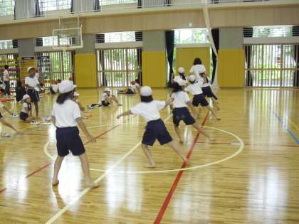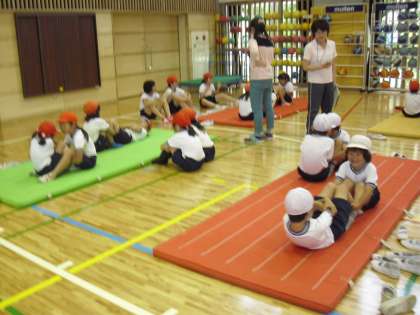3・4年生の様子です。体育館では、反復横跳びと上体起こしを測定します。3・4年生も協力して行うことができました。グループ毎に校庭と体育館を移動しながら4種目に取り組みました。