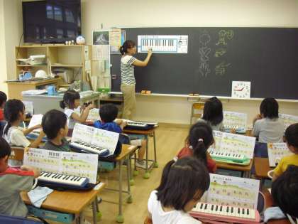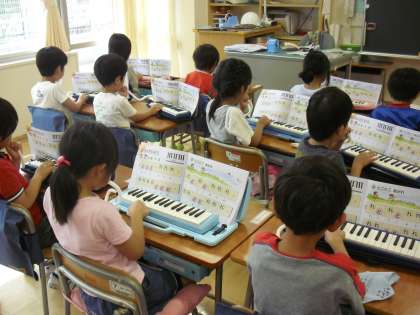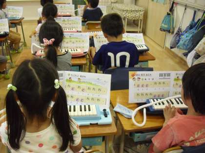 1年生の音楽の授業の様子です。鍵盤ハーモニカを使って音を出しています。「ド」と「レ」の2つの音です。指づかいにも気を付けます。やはり、自分の力で音が出せることは楽しいようです。何回も取り組みました。
