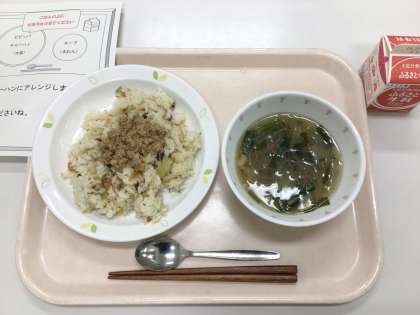 今日は、ビビンバチャーハン、春雨と野菜のスープ、牛乳です。