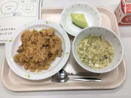 今日は、チキンライス、キャベツと玉子のスープ、メロン、牛乳です。