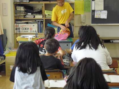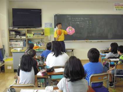 4年生の理科の授業の様子です。バスケットボールの中に入っている空気の量はどれくらいあるかについて考えています。ボールと同じ、ボールより少ない、ボールより多いの3つの中から考えます。子どもたちなりに予想しました。バスケットボールの中の空気を、ビーチボールに送りこむ実験で、バスケットボールよりも大きいビーチボールがふくらみ驚く子どもたち。その理由を言葉や図で表現して自分の考えを発表しました。