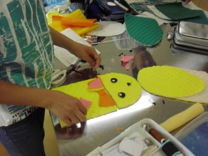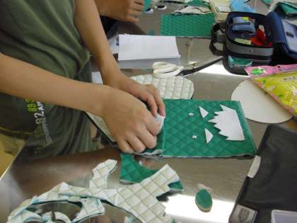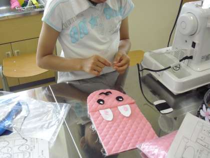 6年生の家庭科の授業の様子です。「なべつかみ」の製作に取り組んでいるところです。型紙に合わせて生地を切りとり、自分がデザインした形を作っています。生活の中でも実用できるように、細かな部分などもていねいに取り組んでいます。