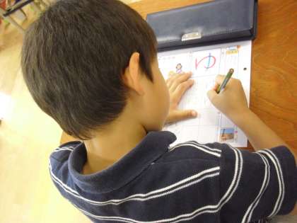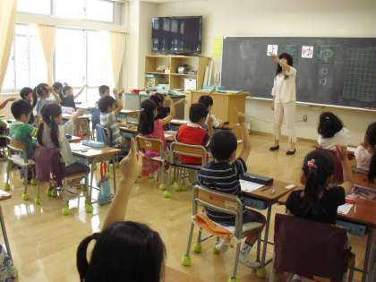 1年生の国語の授業の様子です。ひらがなの「ゆ」の練習をしているところです。担任といっしょに筆順を何度も確かめます。難しいところ、気を付けるところを確認し、練習プリントに取り組みます。何度もなぞりながら形を整えて書きました。