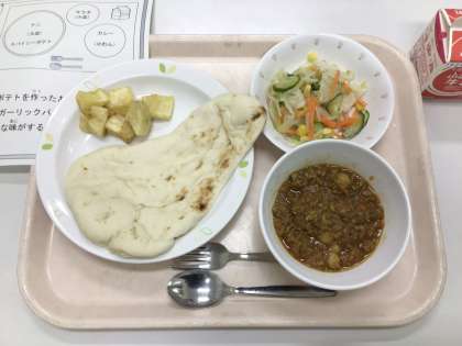 今日は、ナン、キーマカレー、スパイシーポテト、コーンサラダ、牛乳です。