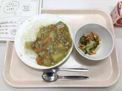 今日は、チキンカレーライス、海藻サラダ、牛乳です。