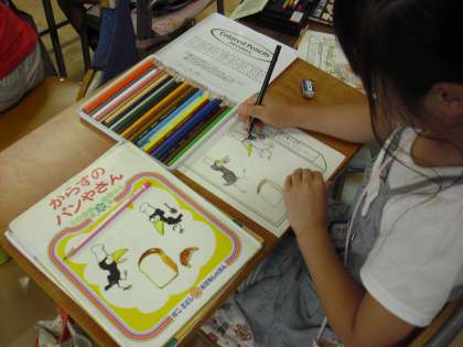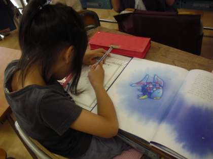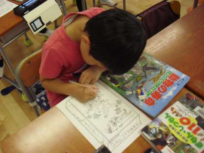 1年生の国語の授業の様子です。自分のお気に入りの一冊を紹介するカードを書いているところです。本の題名、簡単な紹介文、そして本の挿絵を見ながら好きな場面を描いています。6月からは読書月刊が始まります。