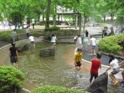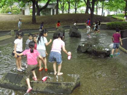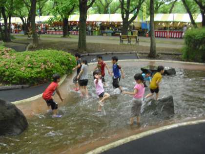 ジャブジャブ池で遊んでいるところです。準備してきた靴に履き替えて水遊びです。子どもたちは大はしゃぎ。友達と水かけっこをしたり、水をかぶったりしながら水遊びを楽しんでいます。