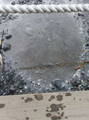 源泉を見学しました。リトマス紙で水質を調べたり、硫黄のにおいや水のあたたかさを感じたりました。