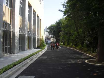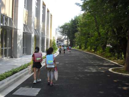 今朝の登校の様子です。今日から、仮設校舎の解体工事が始まり、南門が閉鎖された関係で、南門を利用していた児童・生徒は、八幡山保育園の横を通って、小学校体育館の道を通って北門から登校しました。これまでと違った景色に子どもたちも周りを見わたしながら歩いていました。