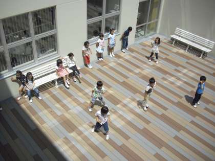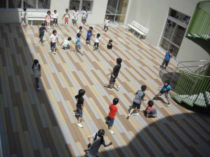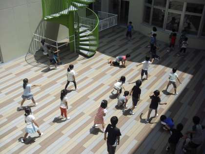 休み時間の様子です。校庭が使用できないので、「森のひろば」も貴重な遊び場となります。「だるまさんがころんだ」を仲良くなっています。日差しが降り注いでいます。