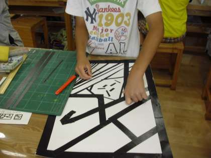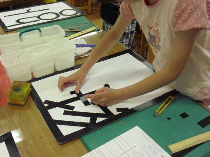 5年生の図画工作の授業の様子です。自分の名前の文字を使って画面をデザインします。漢字でも、平仮名でも、カタカナでも構いません。黒い線は布ガムテープです。テープで区切られた部分に色を付けていきます。線を組み合わせて工夫しています。