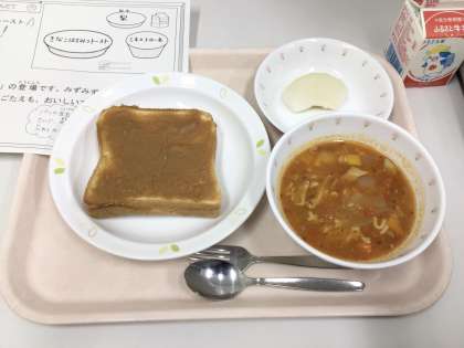 今日は、きなこはちみつトースト、ミネストローネ、梨、牛乳です。
