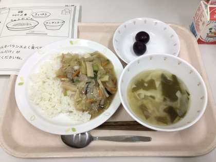 今日は、中華丼、ワンタンスープ、巨峰、牛乳です。