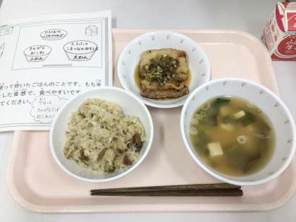 今日は、きんぴらおこわ、太刀魚の香味からあげ、豆腐と小松菜のみそ汁、牛乳です。