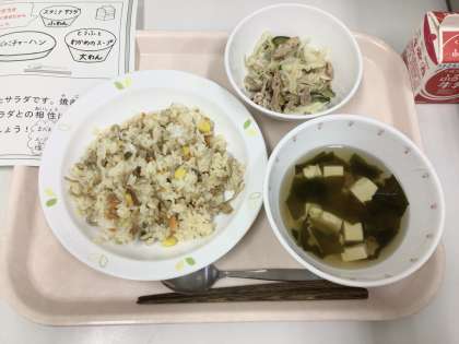 今日は、梅じゃこチャーハン、スタミナサラダ、豆腐とわかめのスープ、牛乳です。