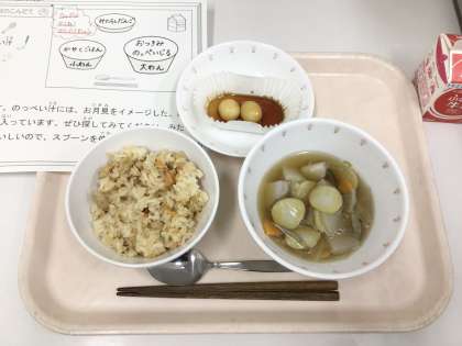 今日は、かやくごはん、お月見のっぺい汁、みたらし団子、牛乳です。