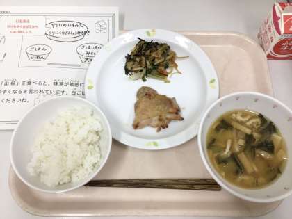 今日は、ごはん、鶏肉の山椒みそ焼き、野菜の磯あえ、さつま芋のみそ汁、牛乳です。