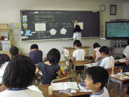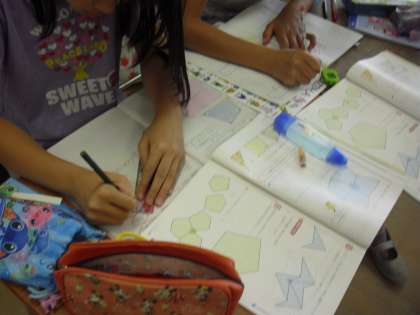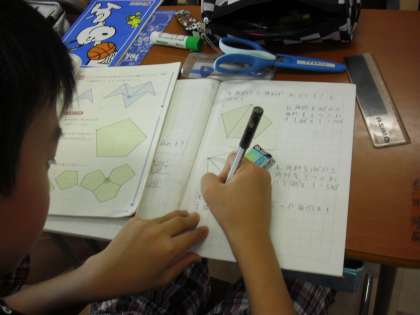 5年生の算数少人数指導の授業の様子です。多角形の学習をしているところです。5角形の内角の和は何度なのか、図形の中に線を描き、3角形を活用しながら内角の和を導いていました。3角形の描き方も人によって違います。友達の考え方を知って自分の考えを練り上げます。