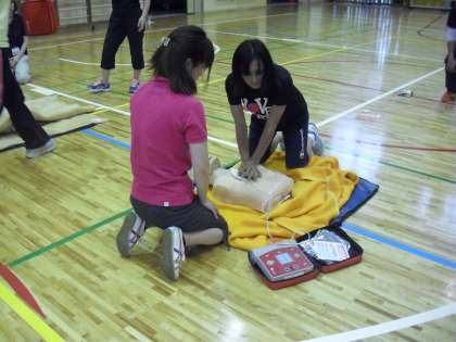 AEDが搬送され、除細動を行う様子です。AEDは電源を入れると音声メッセージで指示を送ります。指示通りに行動することが大切です。胸骨圧迫をしている人とAEDを搬送してきた人が協力して行います。AED除細動と心肺蘇生法を組み合わせた方法で、救急隊が到着するまで救助を続けます。全員の教員が真剣に取り組みました。