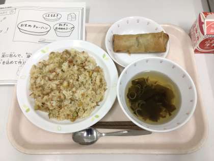 今日は、おまめチャーハン、春巻、ねぎとわかめとスープ、牛乳です。