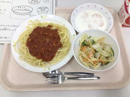 今日は、チキンとトマトのスパゲッティ、ポテトチップスサラダ、みかんヨーグルト、牛乳です。
