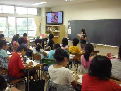 5年生の国語の授業の様子です。お気に入りの本の紹介をしているところです。紹介する人のスピーチを聴いて、聴いている人はワークシートにスピーチのよさや感想を記入していきます。聴き合いながら、互いのよさを認め合っていきます。